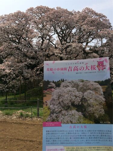 2.3日前まで楽しませてくれた桜は、ほぼ散ってしまい葉っぱの緑の中に、ちょこっと花が残ってる感じ…桜前線北上中です そんな時、以前から行って見たかった印西市のヤマザクラが満開というので出かけました 吉高の大桜 公園の臨時駐車場に車を止めて国道沿い…
